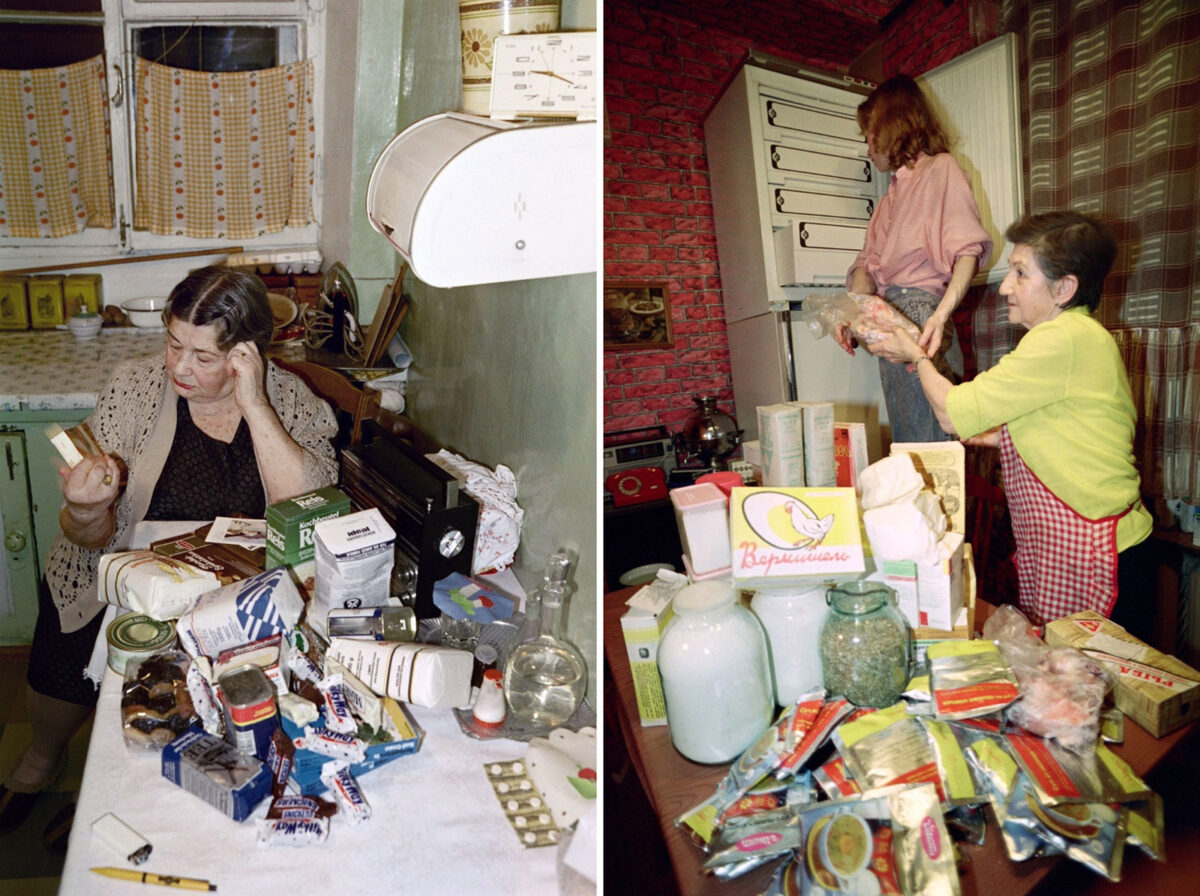 Предновогодние дни. Люди запасаются продуктами. Добрая половина всего, что есть на этих столах — западная гуманитарная помощь, состоящая из сублимированных супов быстрого приготовления, сухих молочных смесей и каш, рыбных и мясных консервов, сухого картофельного пюре, масла и многого другого.