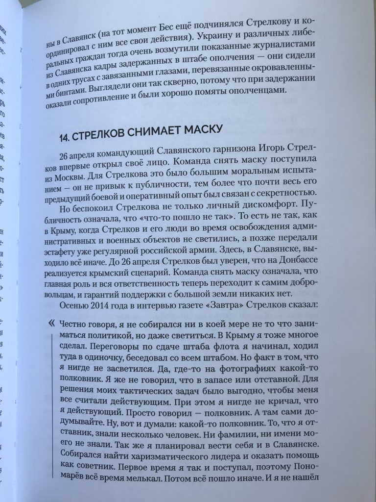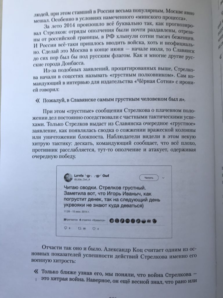 «За лето 2014 произошло все буквально так, как прогнозировал Стрелков: отряды ополчения были почти раздавлены, отрезаны от российской границы, в РФ хлынули сотни тысяч беженцев. И России все-таки пришлось вводить войска, хоть и неофициально», — написал боевик.