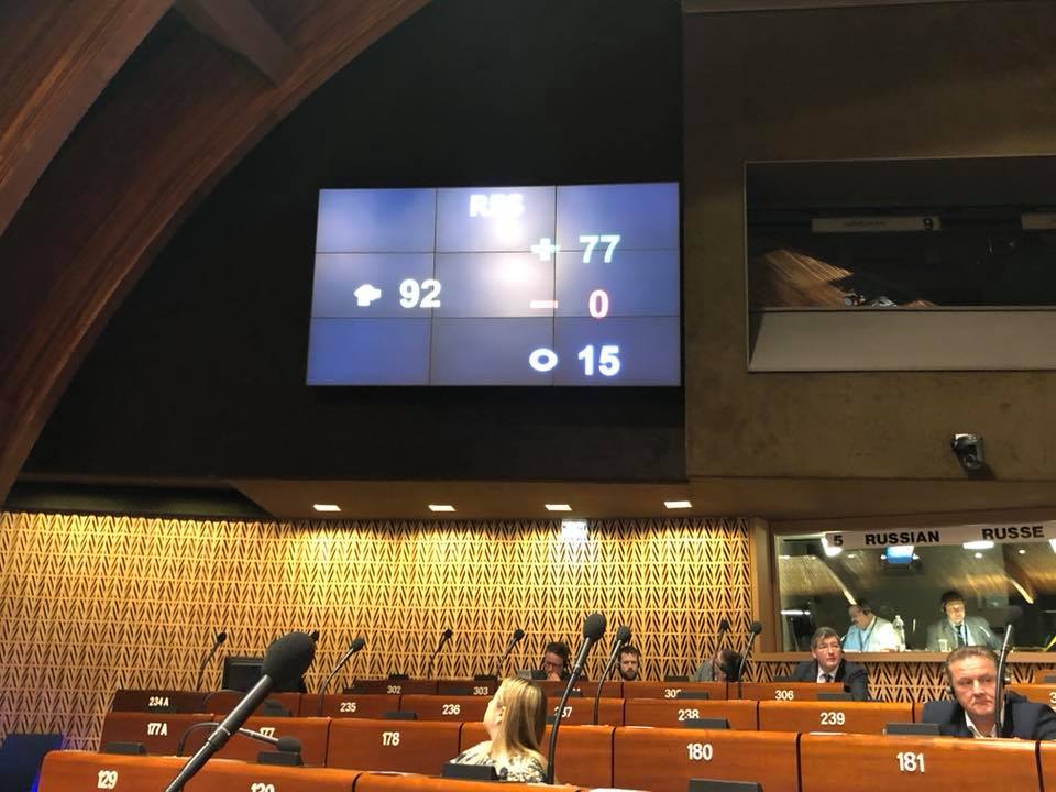 «Резолюция ПАСЕ по украинским политическим заключенным в РФ и Крыму принята! 77 за! России снова указали на ее преступления», — написал Арьев.