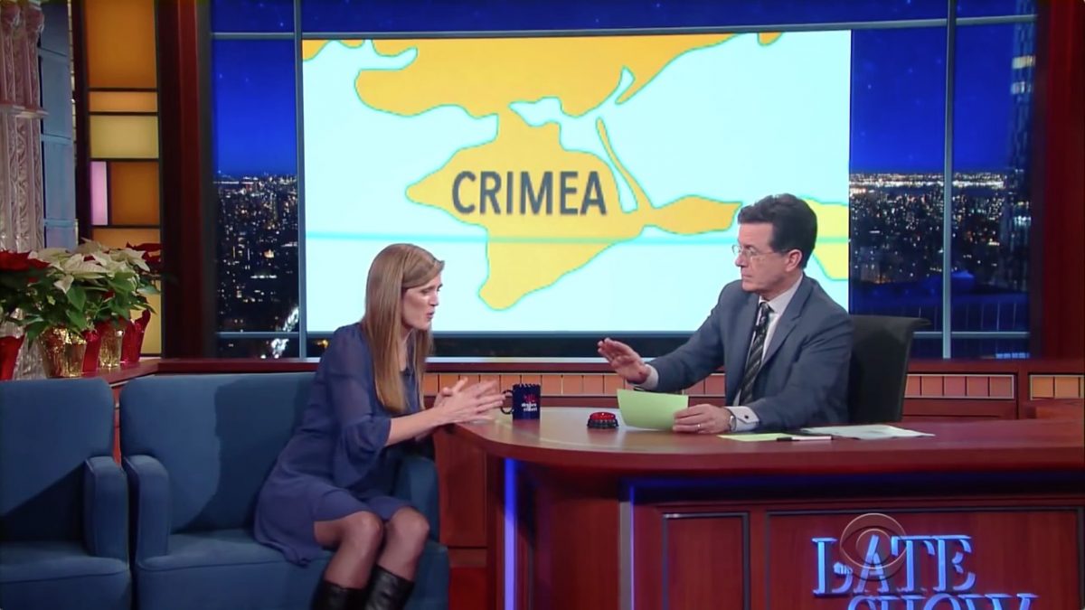 Саманта Пауэр представитель США в ООН в эфире американского телешоу The Late Show with Stephen Colbert, которое выходит на CBS, обсудила в ведущим тему рождественских каникул и затронули тему Крыма.