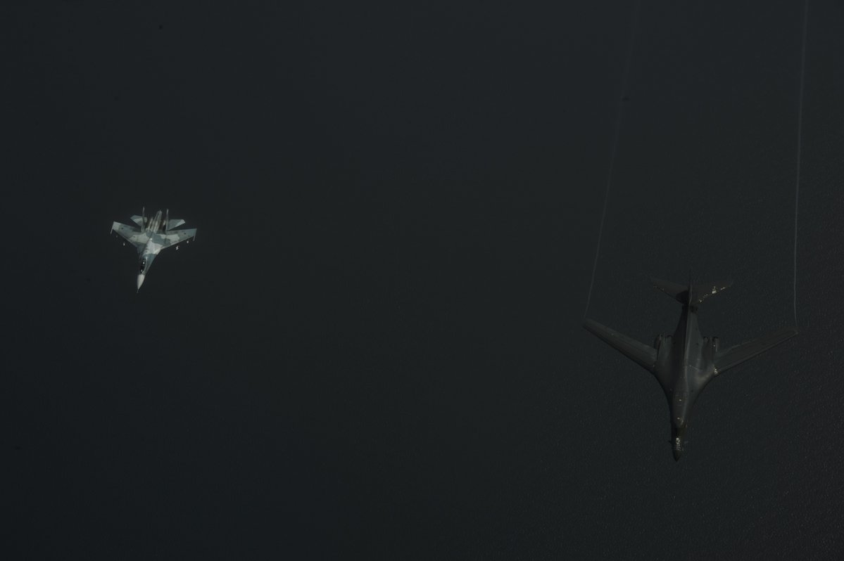 Пентагон опубликовал в своем твиттере кадры перехвата стратегических бомбардировщиков ВВС США российским истребителем Су-27 в небе над Балтикой.