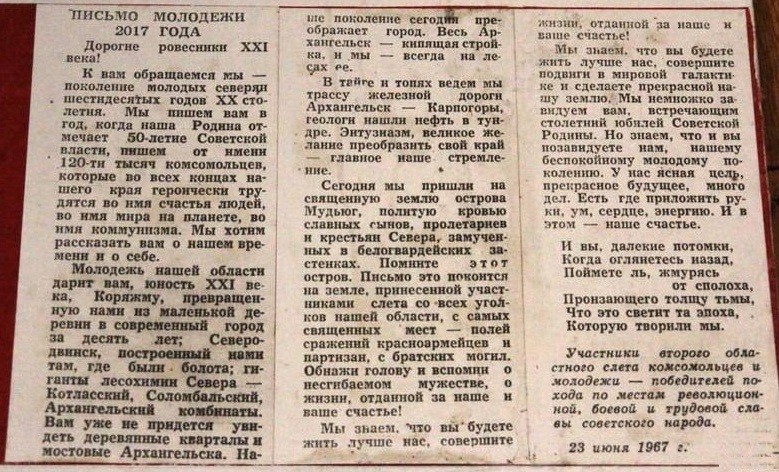 В уже далёком 1967 году группа советских студентов (или как они себя сами обозначили, «участники второго областного слета комсомольцев и молодежи — победителей похода по местам революционной, боевой и трудовой славы советского народа») написали письмо-послание в 2017 год, обращённое к людям нашей эпохи.