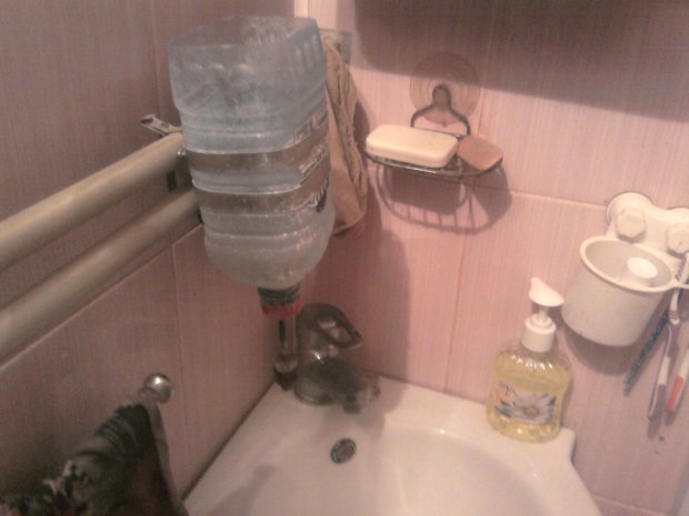 Люди ставят насосы, водружают на крыши баки, ставят в кладовки накопители для воды. Если вы представляете себе размеры хрущевок, то понимаете, что запасами воды там заняты все поверхности – ванна, туалет, пол в кухне, балкон, место на полу в любой комнате… Хороший хозяин в ванной ставит самодельный умывальник по типу деревенских из обрезанной бутылки, чтобы иметь возможность мыть руки не из ведра.