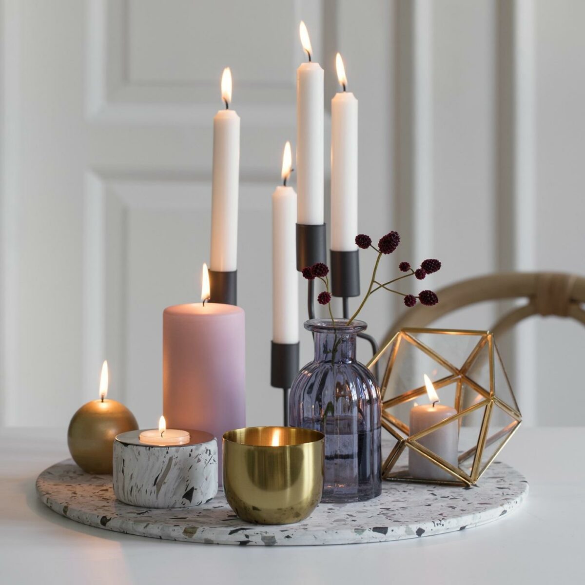 Обратите внимание на материал. Классическими считаются металлические подсвечники, что выглядят массивно и элегантно одновременно. Стеклянные приспособления внесут воздушность и легкость в помещение, а керамика добавит тепла и уюта. Тем, кто предпочитает экзотические материалы, рекомендуются аксессуары из дерева, ротанга или камня.