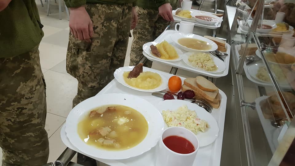 На обед бойцам подавали суп, пюре с мясом, салат и фрукты.