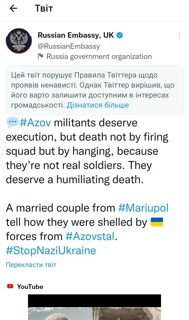 Посольство России в Британии в сообщении в Twitter оправдало убийство бойцов полка «Азов», заявив, что они заслуживают унизительной смерти.