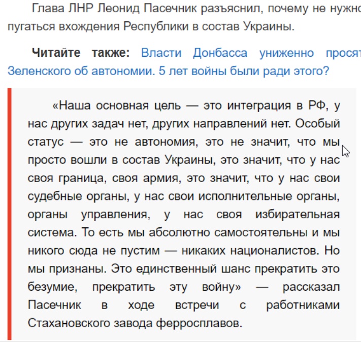 Только вдумайтесь в это высказывание! Они хотят иметь не только свою «конституцию», но и свою «армию» и никого не собираются пускать в свои «руководящие» органы. А самое интересное – это цель всего этого: интеграция в рашу!!!