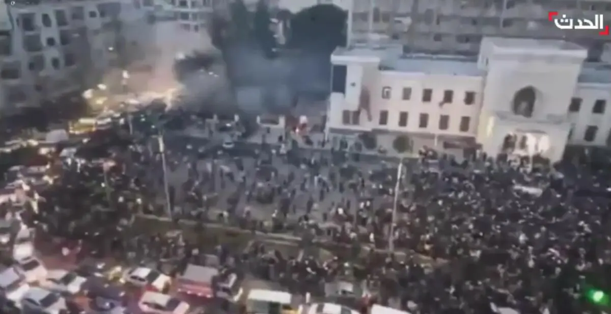 Жители Дамаска идут на главную площадь города с флагами после того, как стало известно, что повстанцы взяли под контроль город, а диктатор Башар Асад сбежал. Жители празднуют победу над режимом и скандируют: «Свобода».