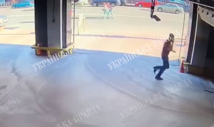 На кадрах видно, как мужчина в красной рубашке остановился возле колонны. Мимо него пробежал мужчина в футболке и с телефоном, за которым гнался Мустафа Найем.