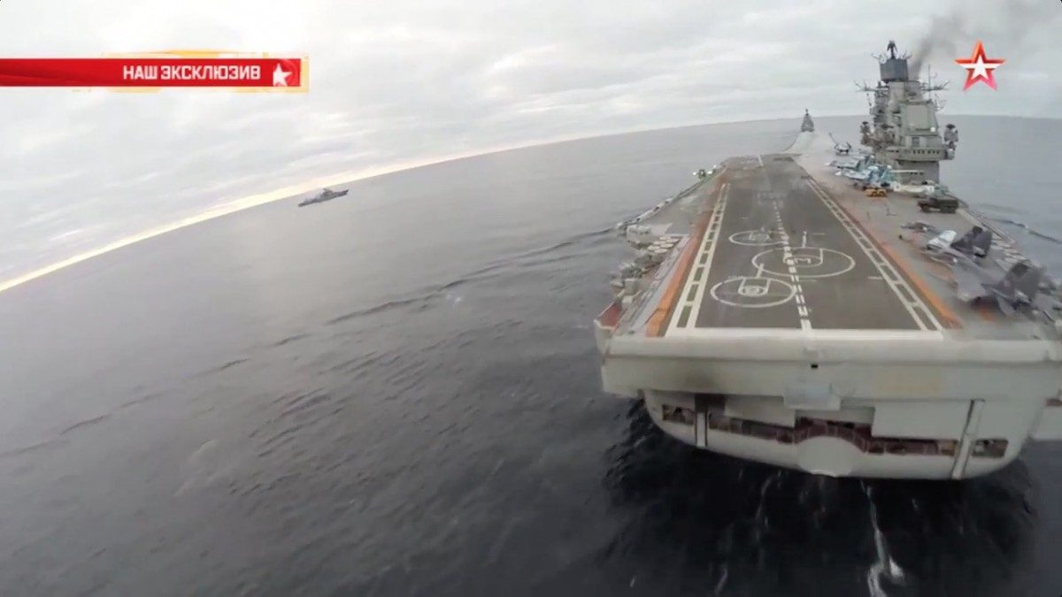 В сети появилась запись, на которой запечатлены моменты взлета и посадки самолетов Су-33 и МиГ-29КУБ с авианесущего крейсера «Адмирал Кузнецов». Соответствующее видео опубликовал на YouTube пропагандистский телеканал «Звезда».