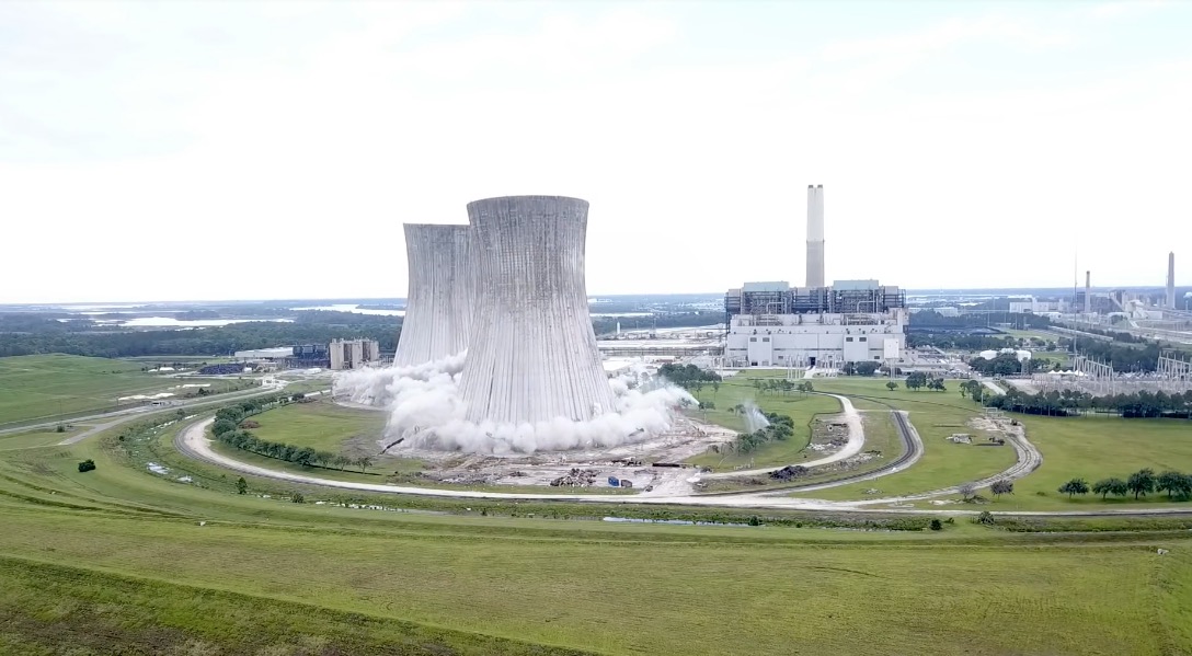 Телеканал отмечает, что 10-секундную операцию готовили 10 недель. Под снос пошли градирни угольной электростанции St. Johns River Power Park. На кадрах видно, как основания обеих башен практически одновременно взрываются, после чего градирни «складываются» внутрь и падают, поднимая огромное облако пыли.