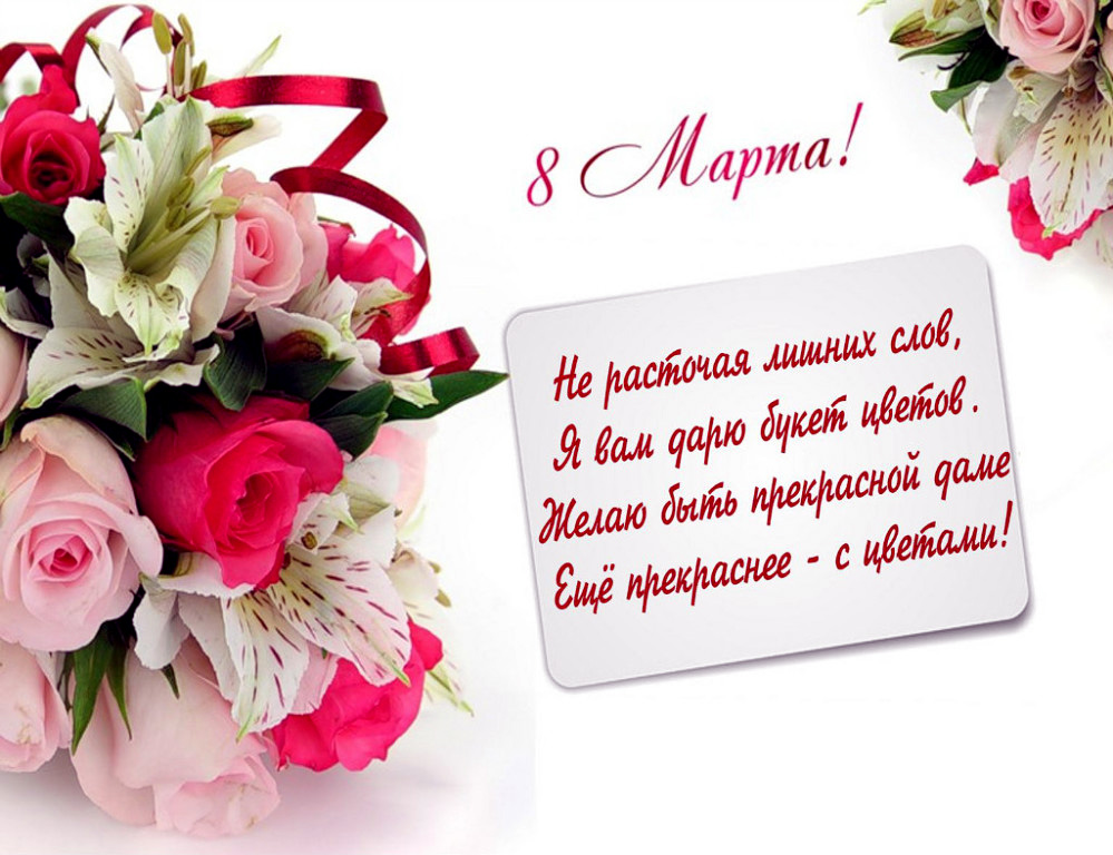 Милые женщины! Поздравляю вас с 8 Марта! Этот красивый праздник в начале весны приходит к нам, когда всё оживает, расцветает и распускается. Пусть в вашей жизни будет вечная весна, пусть ярко светит солнце, пусть поют птицы, пусть дни будут светлыми и безоблачными. Улыбок, хорошего настроения, радости, счастья!