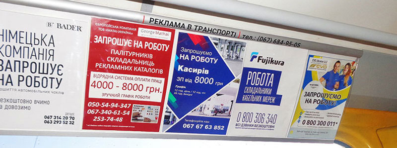 На сегодняшний день рекламу можно встретить почти повсюду. И размещение рекламы в маршрутках не является исключением. Большинство украинцев ежедневно видят рекламную информацию на троллейбусах, трамваях и автобусах общественного транспорта, в метро. Нередко ее размещают на корпоративном транспорте и в маршрутках. При этом клиенты могут подбирать маршруты, где размещать рекламу. Это удобно и выгодно для всех сторон.
