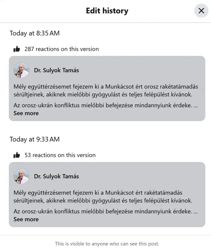 Президент Венгрии Тамаш Шуйок на своей странице в Facebook опубликовал пост, в котором выразил соболезнования в связи с российским обстрелом завода в Мукачево, однако впоследствии удалил из него упоминание о России. Об этом сообщил венгерский новостной сайт Telex.