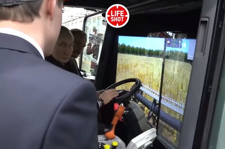 Путину показали учебный тренажерный симулятор зерноуборочного комбайна — макет кабины с выведенным на экран на месте лобового стекла компьютерным изображением полевых работ. Российский президент сел в кресло оператора и, прислушиваясь к инструкциям, «завел» виртуальный комбайн и начал «уборку» урожая.