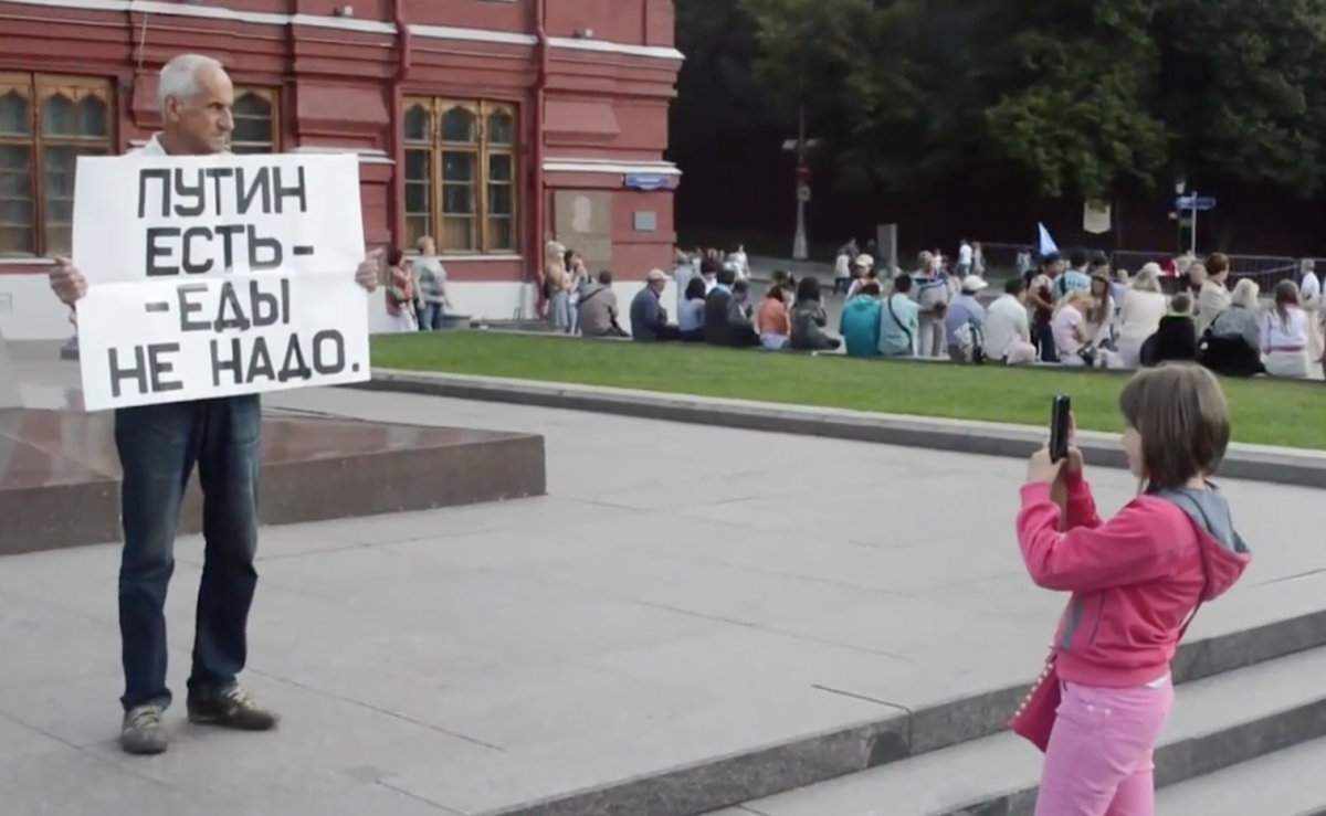 В центре Москвы прошла акция против уничтожения импортных продуктов. Отчаявшиеся митингующие вышли на улицы с транспарантами: «Путин есть — еды не нужно».