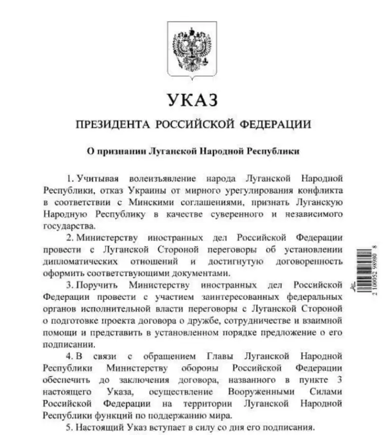 Президент России Владимир Путин поручил Министерству обороны РФ обеспечить поддержание мира в «ДНР» и «ЛНР» при помощи российских вооруженных сил. Об этом сказано в указе президента России.