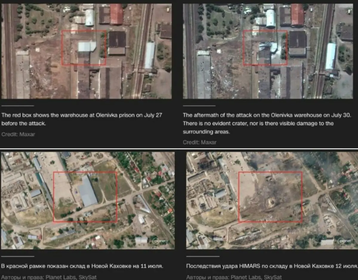 Журналисты обращают внимание, что на фото разбитого барака, сделанных после атаки, видно, что стены здания и большая часть крыши целы. Удар HIMARS должен был нанести гораздо больший ущерб. Для сравнения CNN публикует спутниковый снимок того, что осталось от склада в Новой Каховке, который, как утверждается, был атакован с помощью HIMARS.