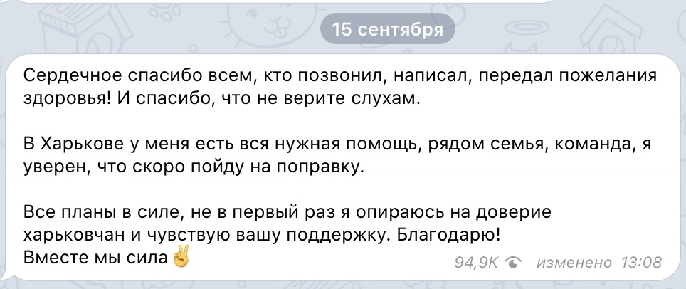 Отметим, что до того как Кернес был госпитализирован он активно вел свой Telegram-канал и практически каждый день в нем что-то писал. Последняя записать в его канале была опубликована 15 сентября. Свою госпитализацию в Германию градоначальник лично не комментировал с тех пор вообще.