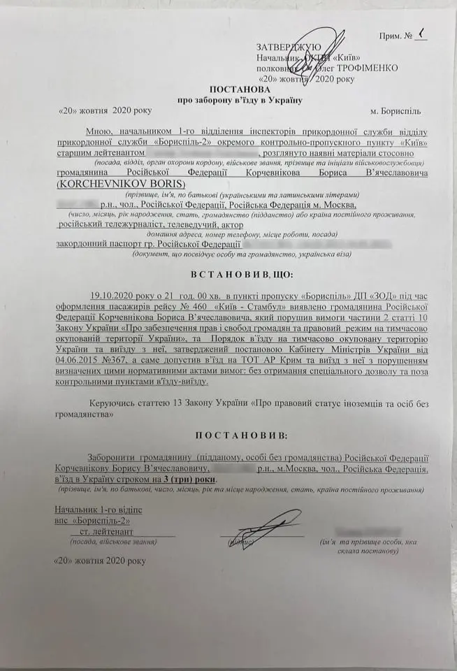 Сотрудники ведомства нашли подтверждение нарушения украинского законодательства и запретили Корчевникову въезд в Украину. Пропагандист вылетел с территории нашей страны авиарейсом «Киев-Стамбул».