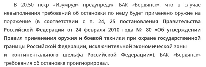 В самом первом пункте этих правил сказано, что они регламентирует порядок применения оружия при осуществлении защиты и охраны границы в пределах приграничной территории, охраны внутренних морских вод, территориального моря. В этих правилах ничего не сказано о применении оружия за пределами указанных зон (ранее было доказано, что Россия применила оружие по украинским кораблям в международных водах), а также о применении оружия против военных кораблей.