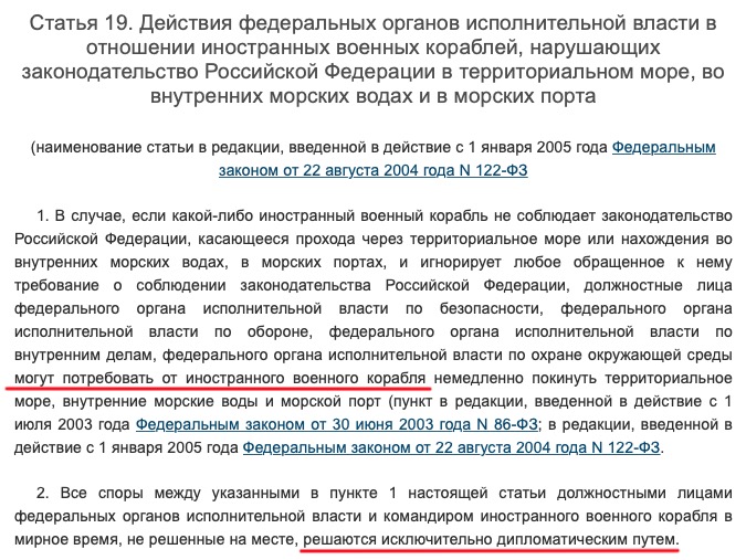 Более того, согласно Статье 19 закона РФ «О внутренних морских водах, территориальном море и прилежащей зоне Российской Федерации» федеральные органы могут требовать от иностранного военного судна покинуть территориальное море и даже внутренние морские воды. Если же это требование было проигнорировано, то спор должен быть решен исключительно дипломатическим путем. Огонь разрешается открывать лишь тогда, когда иностранное военное судно открыло огонь первым.
