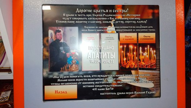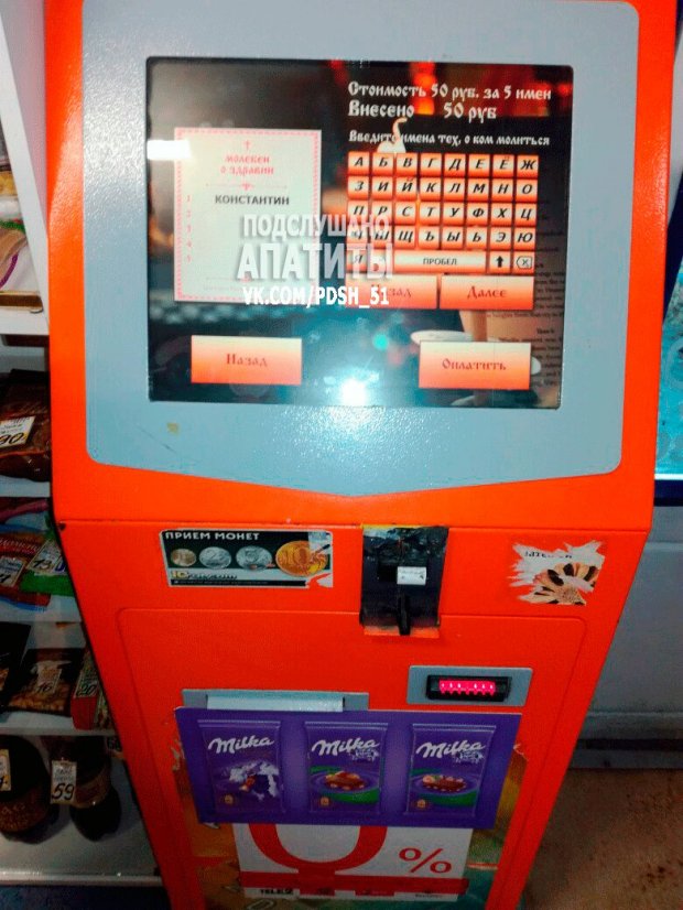 В Апатитах Мурманской области России появился платежный терминал, через который можно поставить свечку за здравие и упокой или заказать молитву. Об этом сообщили в сообществе Подслушано в социальной сети ВКонтакте.