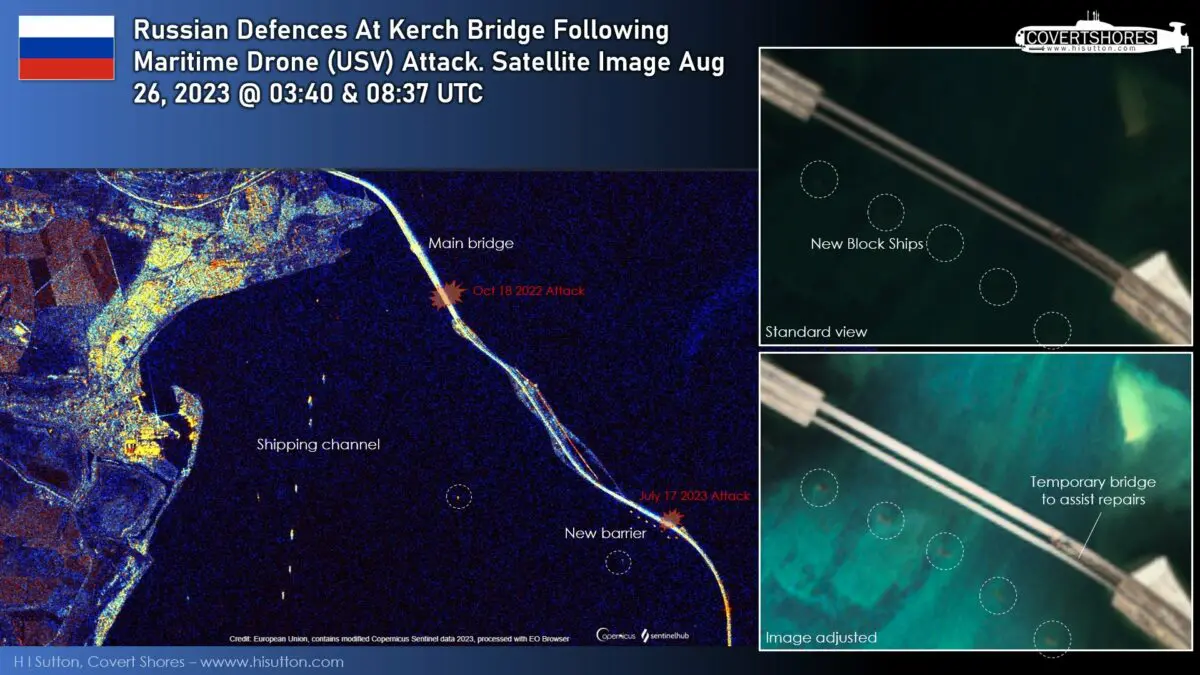 Российские оккупанты топят паромы, чтобы защитить Крымский мост от ударов морских дронов Сил обороны. OSINT-исследователь H I Sutton публикует спутниковые снимки переправы.