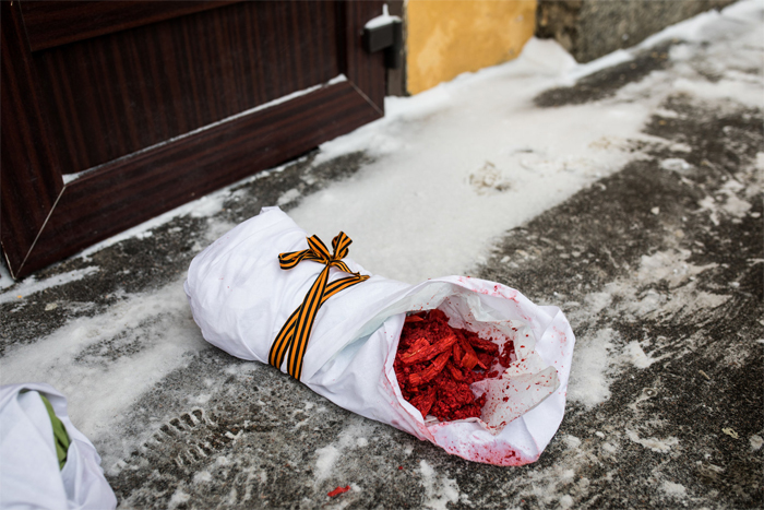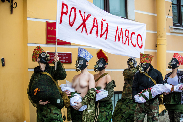 В субботу, 23 февраля, в российском Санкт-Петербурге шесть феминисток устроили у стен военкомата Ленинградской области антивоенный перформанс. Под видом младенцев они принесли к военному учреждению свертки с сырым мясом. Об этом сообщает «Дождь».