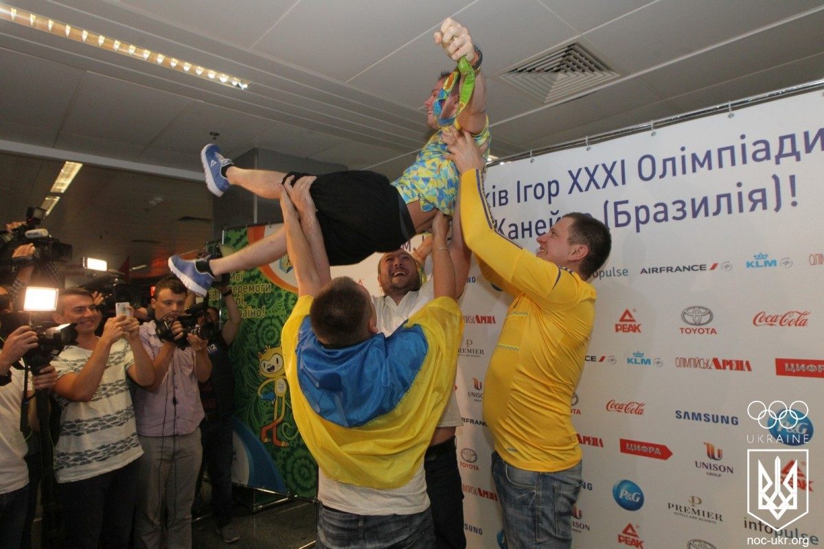 Украинские болельщики встретили олимпийского чемпиона и серебряного призера Олимпийских игр в Рио-де-Жанейро Олега Верняева под гимн Украины, музыкальное сопровождение военного оркестра, с именной футболкой и брызгами шампанского, сообщает НОК.