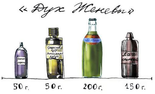 «Дух Женевы». В состав этого коктейля входила «белая сирень», сдерство от потливости ног, стакан «Жигулевского пива» и 150 грамм спиртового лака. Назывался коктейль, кстати, в честь временного потепления отношений между СССР и Западом).