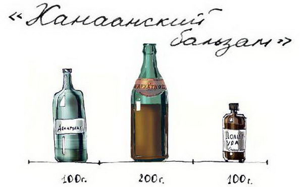 «Ханаанский бальзам». В пропорции 1:2:1 смешивался денатурат, пиво «Бархатное» и очищенная политура (жидкость для очистки и полировки древесины). Получался напиток черно-бурого цвета, получивший за внешний вид и другое название — «чернобурка».