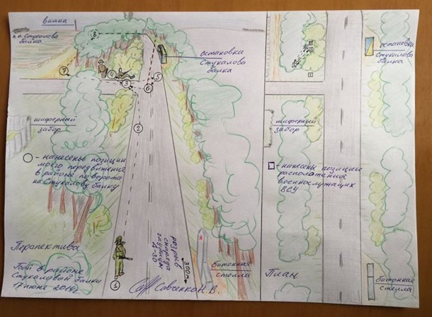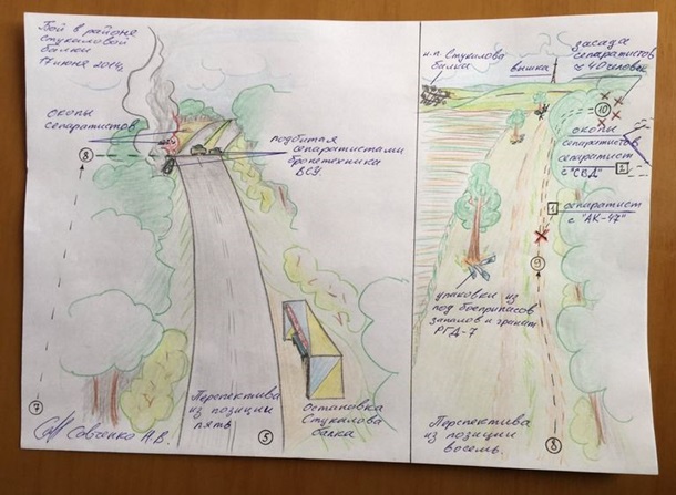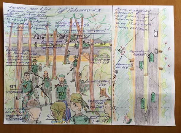 Народный депутат Украины и украинская летчица Надежда Савченко, которую судят России, нарисовала схемы событий 17 июня 2014 года, когда ее захватили в плен. Об этом сообщил один из адвокатов Надежды Николай Полозов, обнародовав фотографии рисунков.