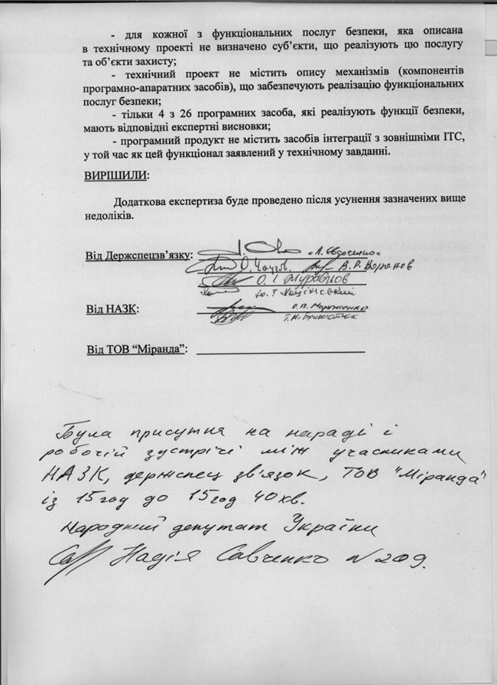 Представители «Миранды» отказались подписывать данный документ, и на нем вместо их подписей стоит надпись «присутствовала на совещании и рабочей встрече… с 15 часов до 15.40. Надежда Савченко».