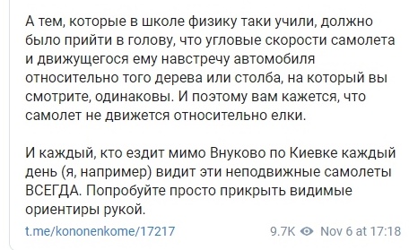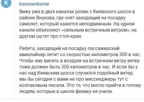 Объяснить происходящее взялся журналист Максим Кононенко. В своём телеграм-канале он пояснил, что ветер просто не может дуть с такой скоростью, чтобы удерживать самолёт, и в действительности зрелище объясняется законами физики.