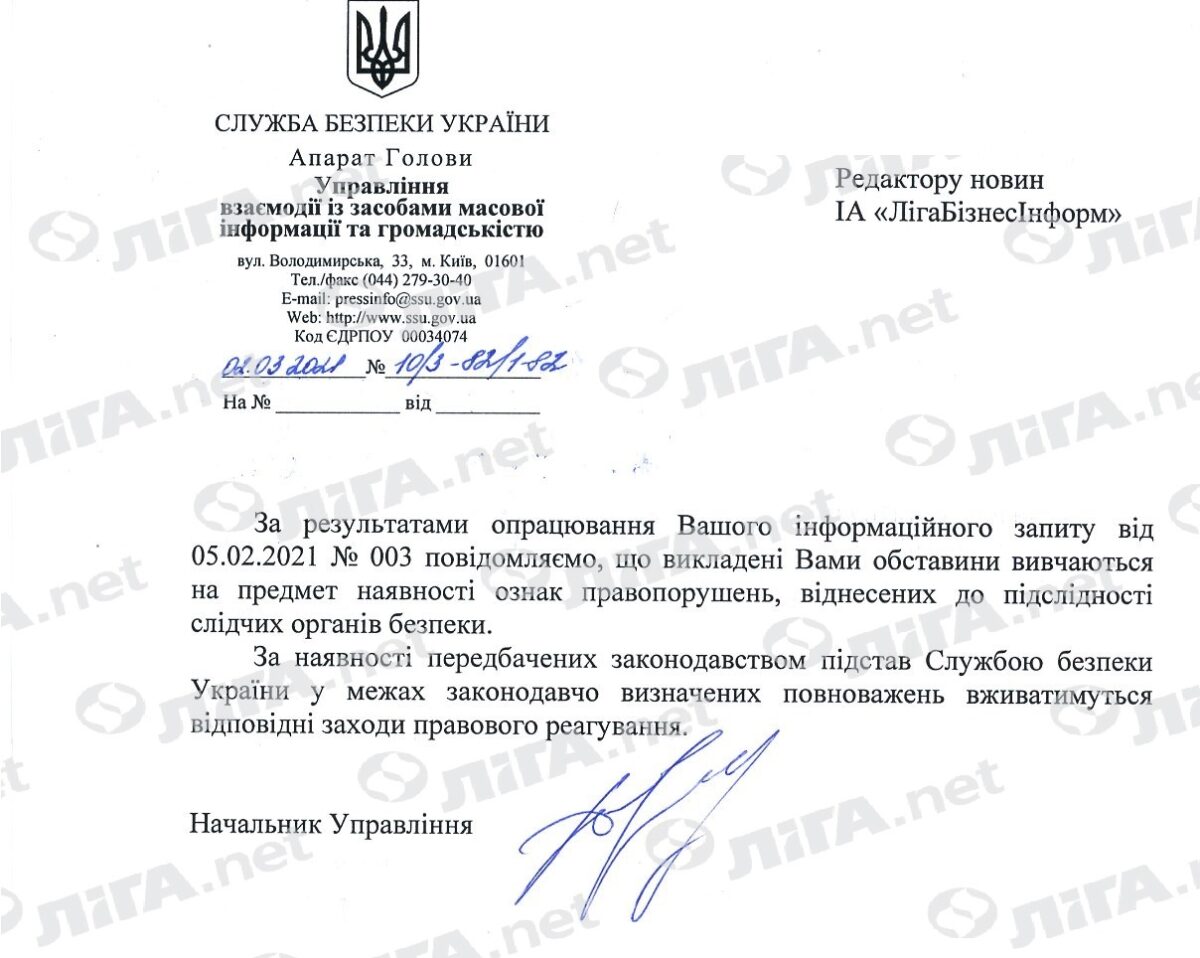 Соответствующее сообщение издание получило в ответ на свой запрос в спецслужбу.