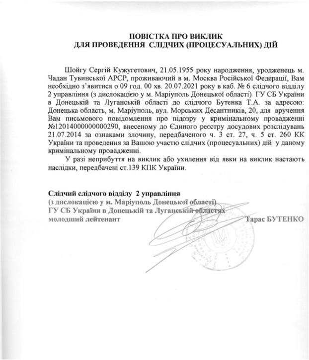 Также указано, что украинские правоохранители хотят провести с Шойгу следственные действия. Повестка подписана следователем главного управления СБУ в Донецкой и Луганской областях Тарасом Бутенко.