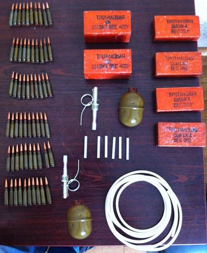 В ходе спецоперации на Ровенщине у злоумышленника, который отвечал за учет и выдачу боеприпасов на Ровенском общевойсковом полигоне, оперативниками приобрели шесть тротиловых шашек общим весом 1,6 кг со взрывателями, «бикфордов шнур», гранату РГД-5 с запалом, патроны калибра 5,45 мм.