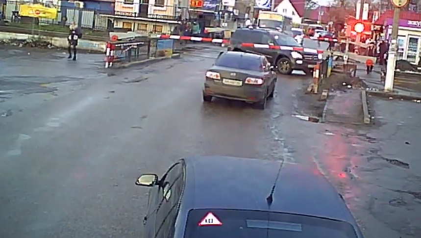 На записи с видеорегистратора видно, как водитель кроссовера Mercedes-Benz пытается проскочить переезд в момент закрытия шлагбаума. Однако у него это не получается и машина оказывается зажата между двух шлагбаумов.