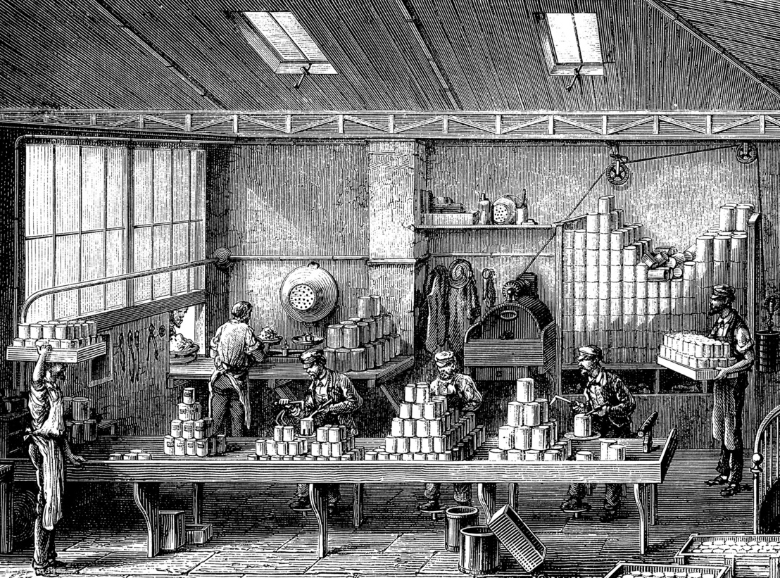 Позже, в середине XIX века, американский промышленник Гейл Борден открыл способ вакуумного сгущения молока, и в 1858 году начал выпускать промышленные консервы — сгущённое молоко с сахаром. Борден выпускал целых 300.000 галлонов сгущёнки в год — её массово использовали в качестве питания солдаты Гражданской войны в Америке. Вот примерно так выглядело производство сгущёнки в то время: