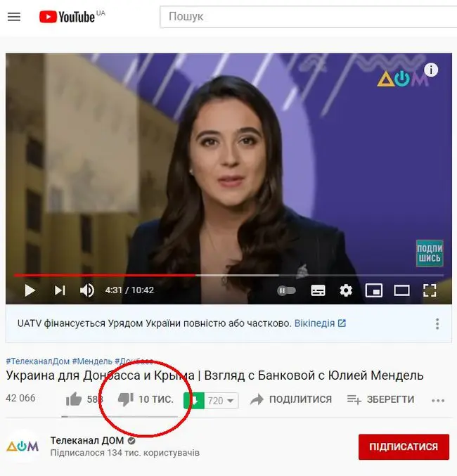 Телевизионное шоу пресс-секретаря президента Владимира Зеленского Юлии Мендель набрало в 20 раз больше дизлайков, чем лайков. Об этом свидетельствуют показатели лайков на ютуб-странице телеканала «Дом».