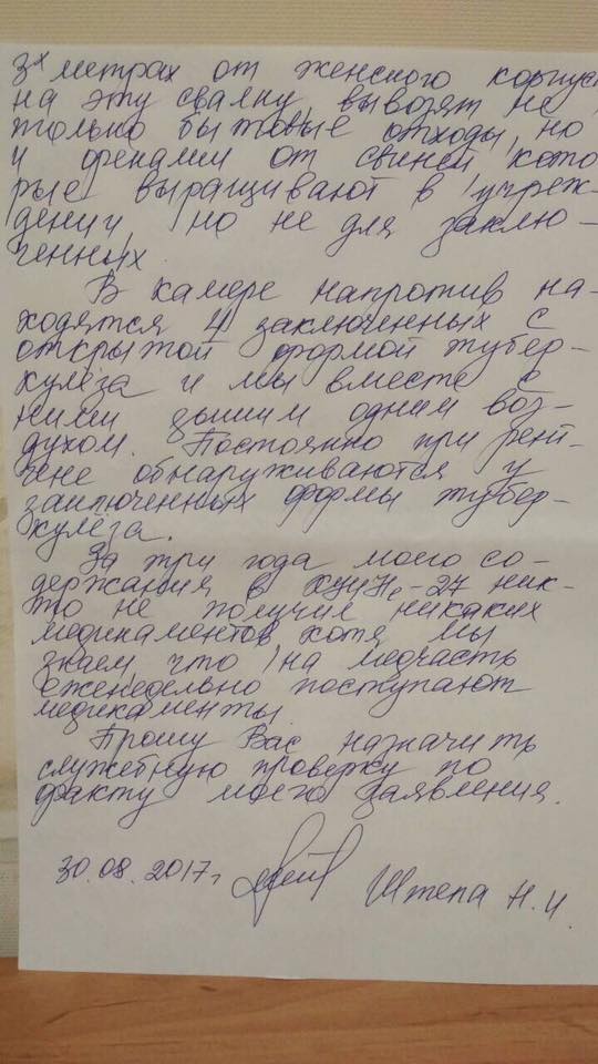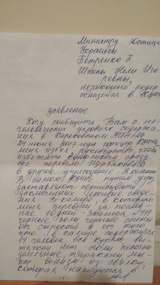 Штепа написала обращение к министру юстиции и Уполномоченному Верховной Рады по правам человека. В нем женщина рассказывает об избиениях в следственном изоляторе.
