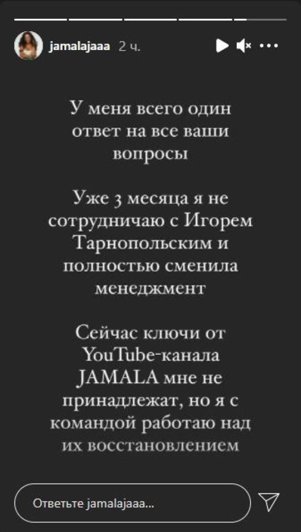 Ранее Джамала коротко прокомментировала ситуацию с исчезновением аудиовизуального контента со своего YouTube-канала. В разделе «сторис» Instagram она подтвердила, что уже три месяца не работает с Тарнопольским и сменила менеджмент.