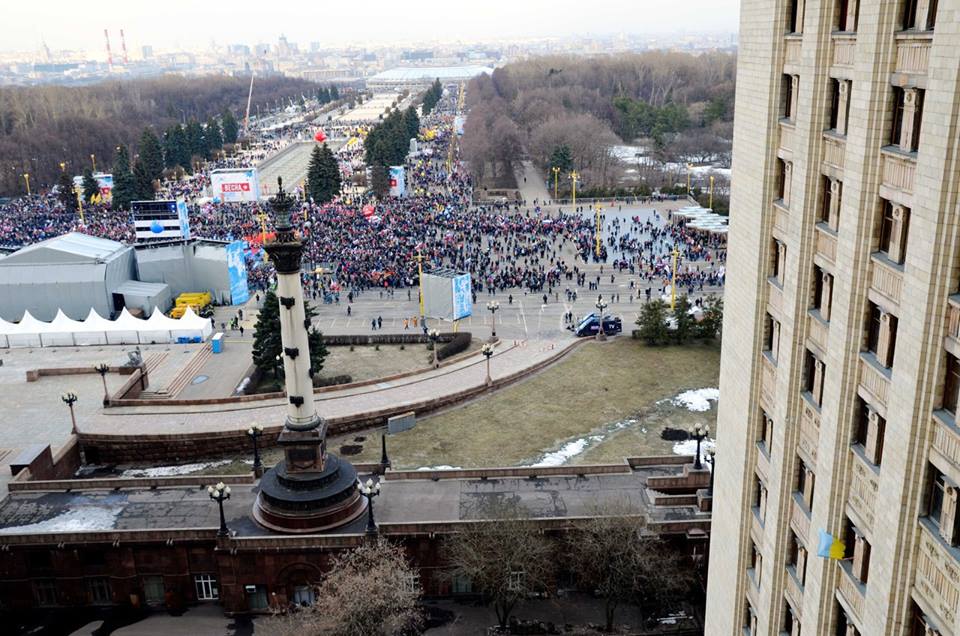 Сотрудники ФСБ задержали и избили аспиранта исторического факультета МГУ после того, как он вывесил из окна общежития флаг Украины во время концерта «Весна» в честь присоединения Крыма. Об этом пишет «Медиазона» со ссылкой на друга аспиранта, пожелавшего остаться анонимным. Имя аспиранта также не раскрывается.