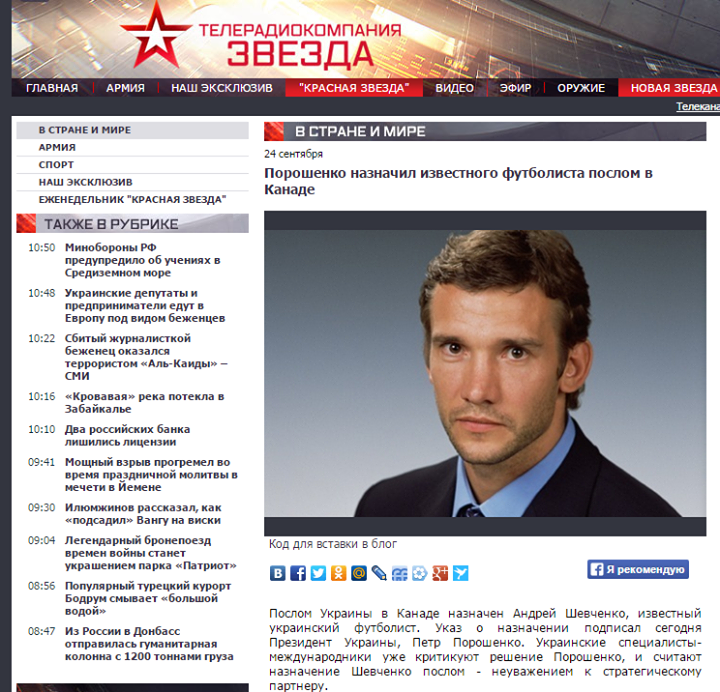 «Порошенко назначил известного футболиста послом в Канаде. Украинские специалисты-международники уже критикуют решение Порошенко, и считают назначение Шевченко послом — неуважением к стратегическому партнеру», — говорится в российской пропагандистской новости.
