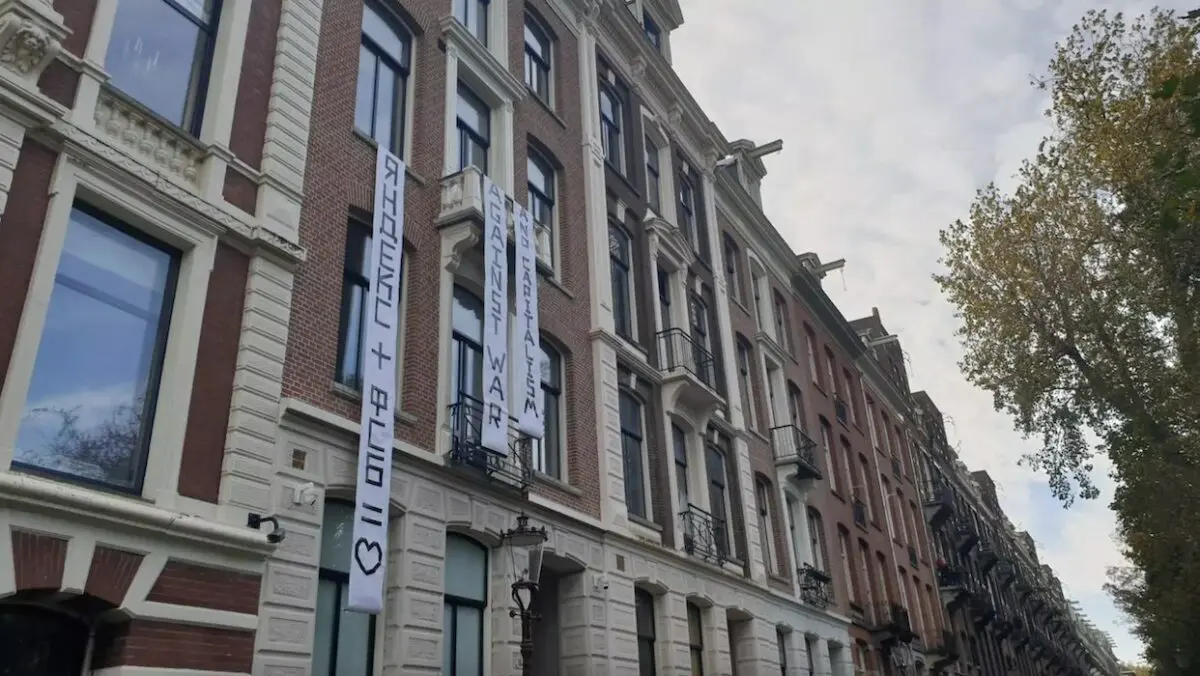 На фасаде здания сквоттеры вывесили растяжки с антивоенным лозунгом и обвинением российской IT-корпорации в сотрудничестве с ФСБ РФ. Один из лозунгов написан по-русски: «Яндекс+ФСБ=любовь (знак сердца)». На двух других растяжках написаны призывы против войны и капитализма.