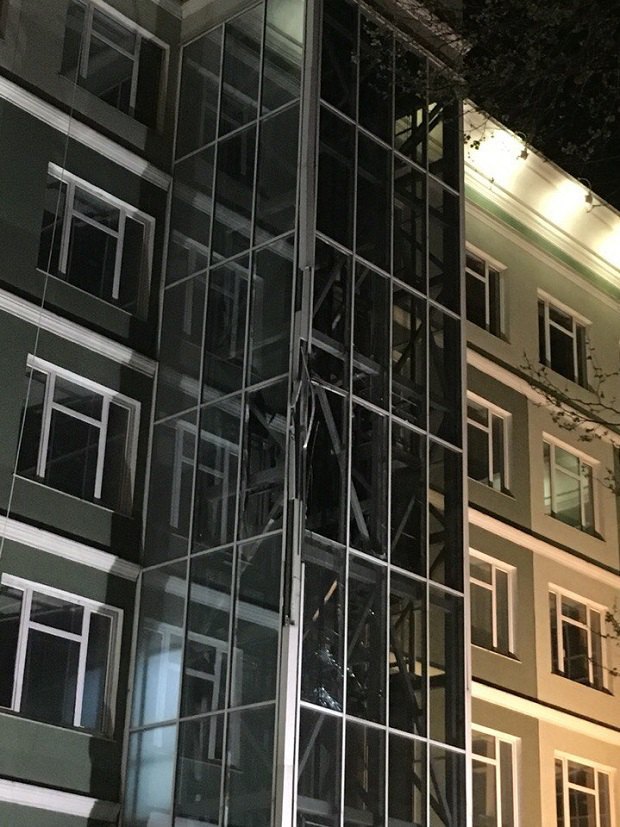 Очевидцы в соцсетях сообщают, что было слышно два взрыва, сильно повреждена шахта лифта банка «Пивденный», который находится в здании.