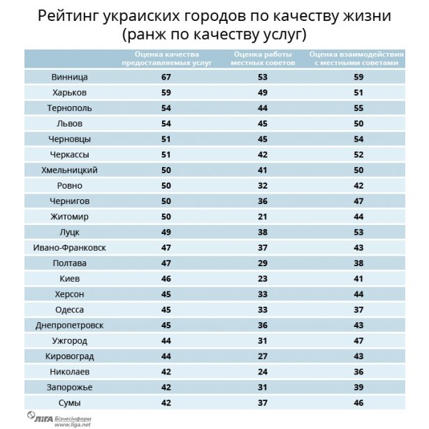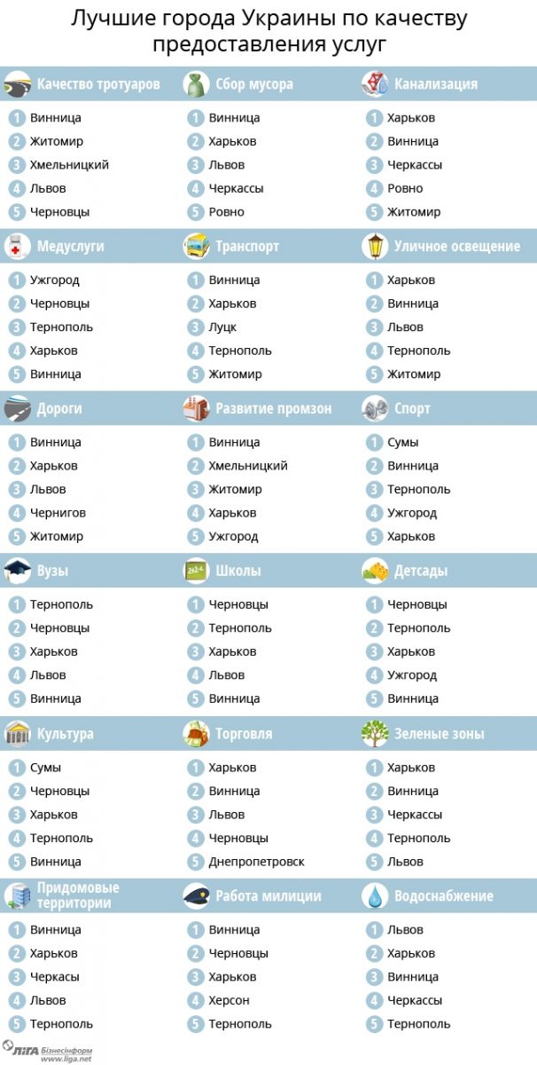 Винница вошла в тройку лидеров по 13 показателям из 18 критериев, Харьков лидирует в 14 номинациях.