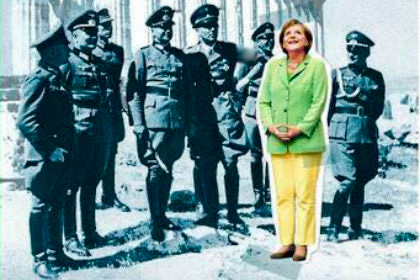 Свежий номер немецкого журнала Der Spiegel вышел в свет с фотоколлажем на обложке, на котором канцлер Ангела Меркель помещена среди группы нацистских деятелей времен Второй мировой войны на территории Афин. Обложка связана со статьей, которая повествует о текущих проблемах во взаимоотношениях Германии и Греции.