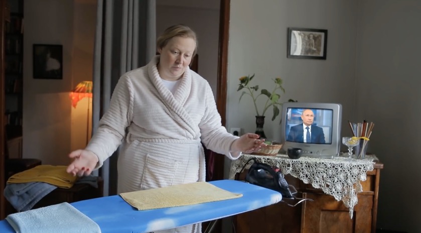В ролике Юлия Ауг в халате гладит белье на фоне телевизора, по которому показывают Путина.